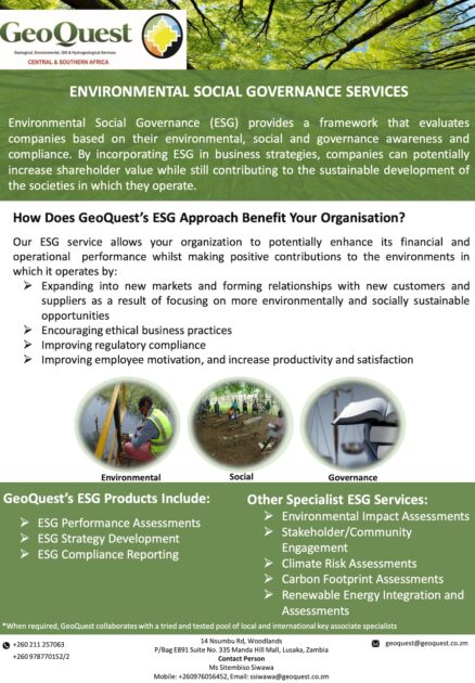 GeoQuest is pleased to announce the addition of a new service to its current portfolio of Environmental services. The ESG Consultancy Service is aimed at assisting our clients in making their businesses more sustainable by potentially enhancing their financial and operational performance whilst making positive contributions to the environments in which they operate. The service includes ESG Performance Assessments, ESG Strategy Development, ESG Compliance Reporting etc.